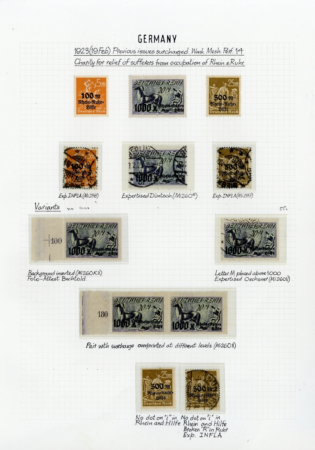 1923 Relief Fund mint and used selection (16) including 20 + 1000m. indigo and green with background inverted, unmounted mint from the left of the sheet (Bechtold (1995) Certificate). S.G. 259a, £600, Michel 260K II, €1,000), etc., fine