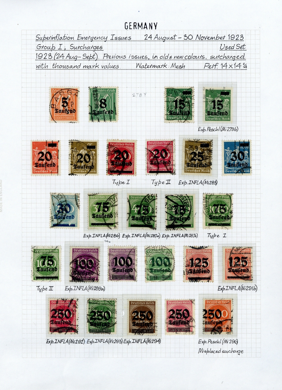 1923 Inflation provisionals, a specialised mint and used collection housed in a red album, hundreds including 1923 (Aug.-Oct.) 800t. on 500m. yellow-green (signed Infla), 1923 (Oct.-Nov) zig-zag roulette 20M. blue used (signed Peschl), 50Md. light blue used (signed Infla), etc., many varieties with imperforates, imperforate between stamp and margin, inverted and double surcharges, unissued values, etc., chiefly fine. A valuable and interesting lot worthy of careful inspection