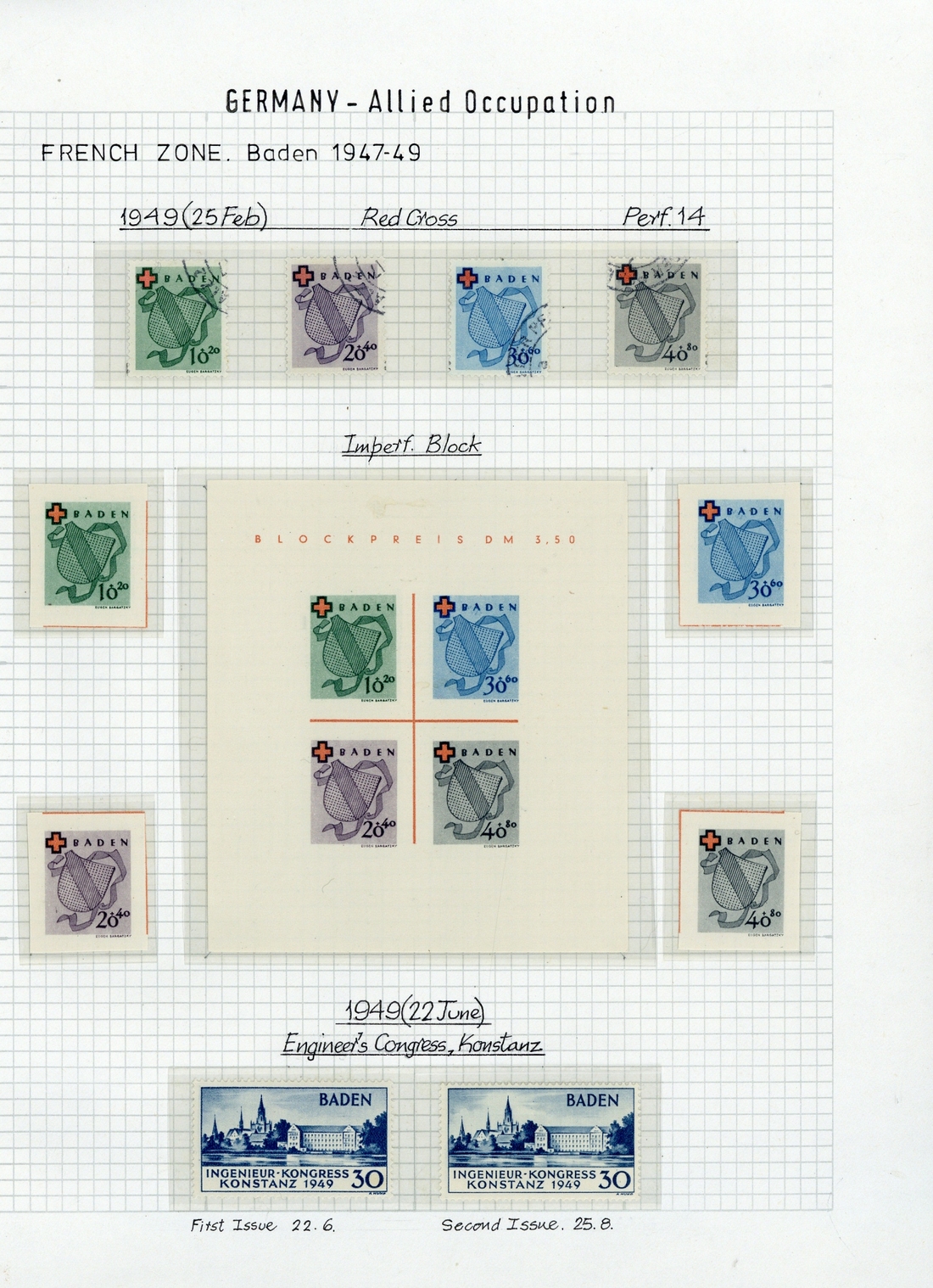 1945-49 mint and used collection in a red album, hundreds including Allied Military Post 1945-46 Westerman set mint and set except 8pf., 80pf. and 1m. used, American, British and Soviet Russian Zones 1946-47 miniature sheet perf. and imperf., British and American Zones 1948 Currency reform band and overprint sets of 17, 1948-50 Buildings, 1949 Hanover fair miniature sheet, French Zones Baden 1948-49 "PF" omitted sets mint and used 1949 Freiburg set and miniature sheets, 1949 Red Cross set (used) and miniature sheet, Rhineland Palatinate 1948-49 "PF" omitted set, 1949 Red Cross set and miniature sheet, Württemberg 1948-49 "PF" omitted set, 1949 Red Cross set and miniature sheet, etc., chiefly fine