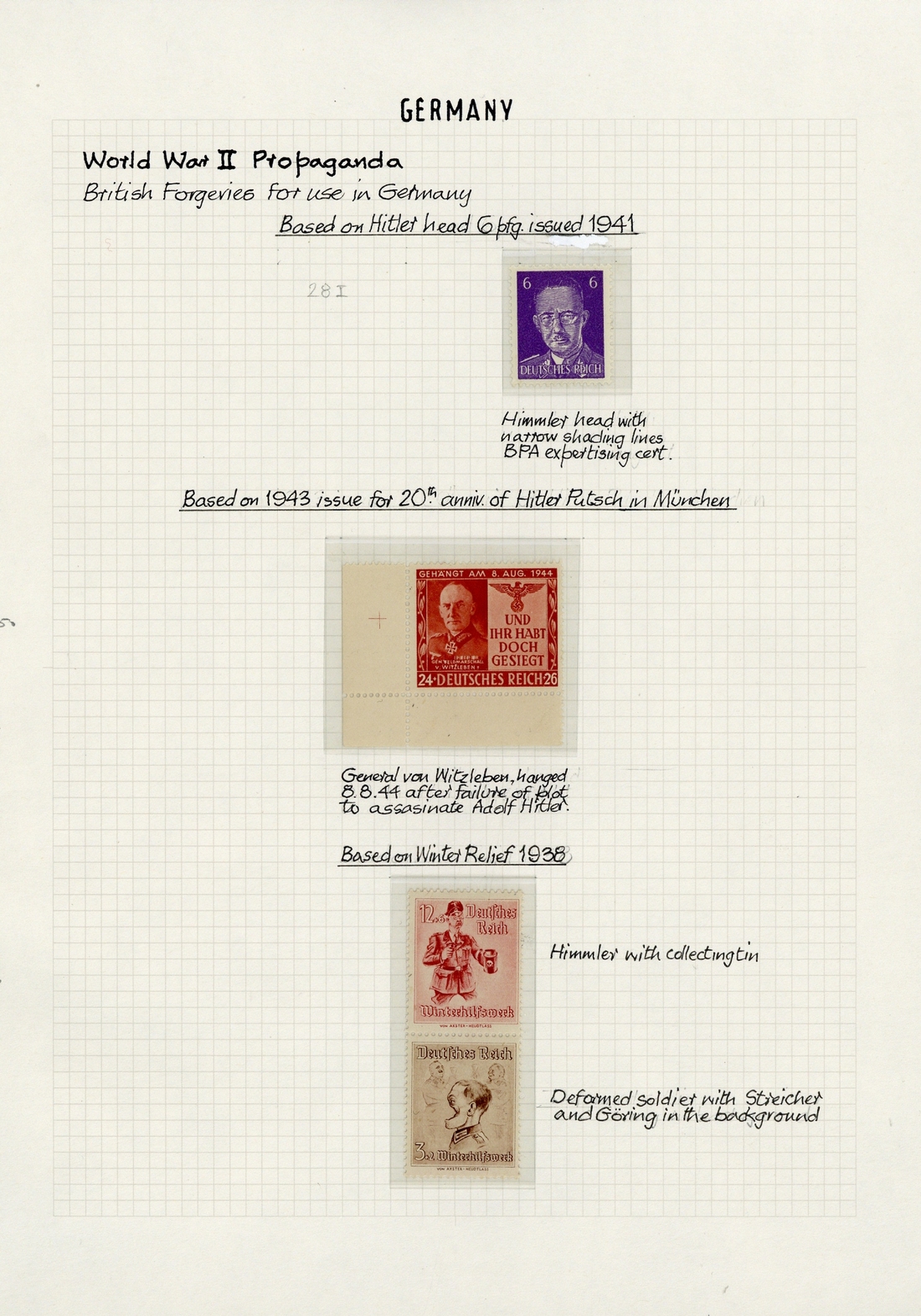 German propaganda forgery of Great Britain 1935 Silver Jubilee ½d., British propaganda forgeries, Himmler 6pf. type II (unmounted mint), Von Witzleben 24pf. + 26pf., Winterhilf 3pf. + 2pf. and 12pf. + 6pf. se tenant pair (mint, red marks on reverse), O.S.S. Hitler skull "futsches reich" 12pf. block of four; fine