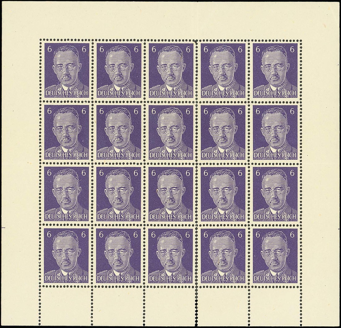 British Forgeries:1943 Himmler 6pf. violet type I, a complete sheet of twenty (5x4), unmounted mint, separated vertically between stamps three and four although still attached in margin, position three defective at top right corner otherwise fresh and fine. A very rare item. Michel 28 I, €40,000+. Photo