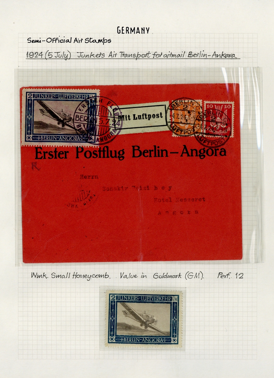 1912-33 mint and used collection on leaves, including 1912 (Feb.) Bork-Brück (-) violet unmounted mint and used on piece (Sieger (1996) Certificate), 1912 (May) Bork-Brück (-) violet on 5pf. postal stationery card, 1912 Gotha-Erfurt (-) unmounted mint, 1913 Mülhausen-Feldburg (-) lilac red on card (Germania stamp missing), 1924 Berlin-Angora 2GM. unmounted mint and on red cover, 1933 Balloon Exhibition, the three on separate cards, etc., chiefly fine