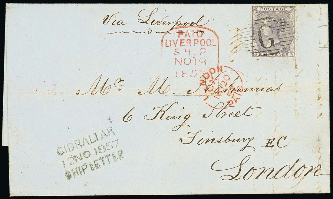 1857 (12 Nov.) entire to London bearing 1856 6d. lilac tied by "G" in barred oval, blue-green "gibraltar/12 no 1857/ship letter", red "paid/liverpool/ship" tombstone (19.11) and "london/paid" c.d.s. (20.11) in the same colour, all on the front; light horizontal filing fold crossing the red datestamp, otherwise fine. S.G. Z11. Photo