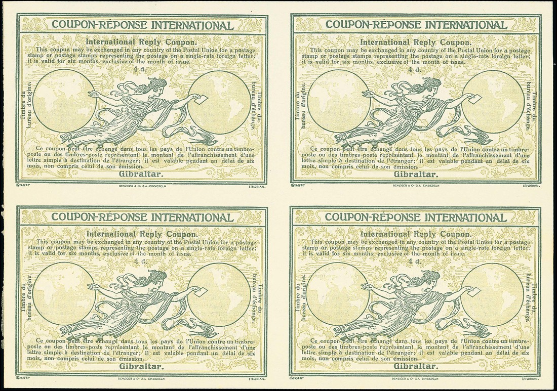 1925 International Reply coupon, Stockholm design block of four without issuing office cancellations; trace on mounting on reverse at left, otherwise fine and fresh. Unique. Photo