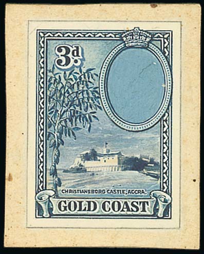 1938-44 3d. handpainted essay showing Christianborg Castle and with portrait oval blank, stamp-size in blue with country name, value tablets, etc., picked out in Chinese white, on card (32mm x 40mm). Unique and most attractive. Photo