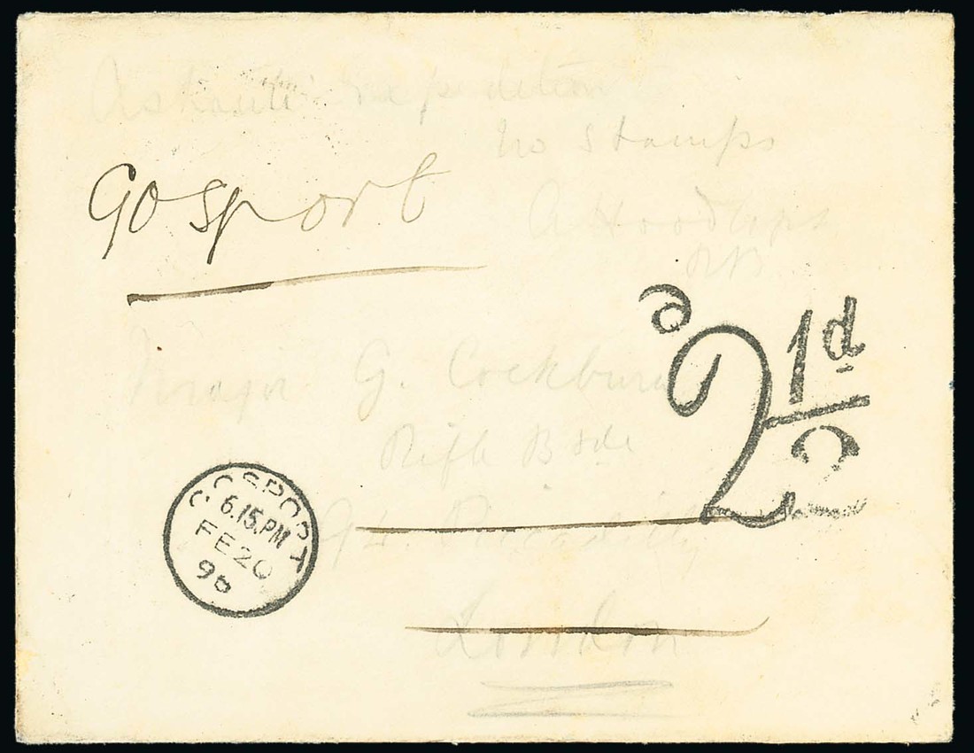 1896 unstamped envelope from Capt. Acland Hood of the Rifle Brigade to London and redirected to Gosport, headed "Ashanti Expedition, No Stamps", showing handstruck "d2½d", Gosport arrival c.d.s. (20.2) with, on reverse, Liverpool Br. Packet (19.2) and London (20.2) datestamps; the envelope with most of flap missing. Photo