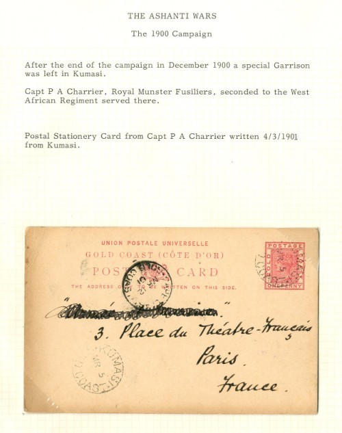 1901 (4 Mar.) 1d. stationery card from Capt. P.A. Charrier, Royal Munster Fusiliers, seconded to the West African Regiment, addressed to Paris (addressee's name expunged), cancelled by light "kumasi/gold coast" c.d.s. and showing Cape Coast transit datestamp; the card with some peripheral browning