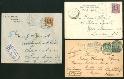 1915 (16 Feb.) KE ½d. stationery card, uprated with KGV ½d., from Coomassie to Switzerland and censored on arrival; also 1906 (21 Apr.) picture postcard (Kumasi. The Fort, view from south) used from Winnebah to London, 1915 unstamped picture postcard from Accra to Plymouth, marked "Active Service..." (rest of endorsement torn away presumably by censor) and showing London "received from h.m. ship/no charge to be raised", and 1916 (16 Sept.) envelope registered from Winnebah to London bearing KGV 3d.
