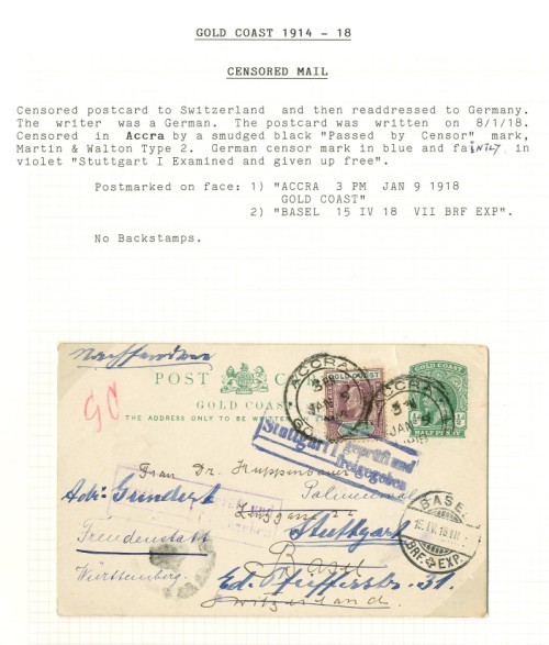 1918 (9 Jan.) ½d. stationery card uprated with KE ½d. from Accra to Switzerland and then re-addressed to Germany, showing smudged "passed by censor" h.s. (Type 2) in black, Basel c.d.s. (15.4) and two German censor h.s., in blue and faintly in violet