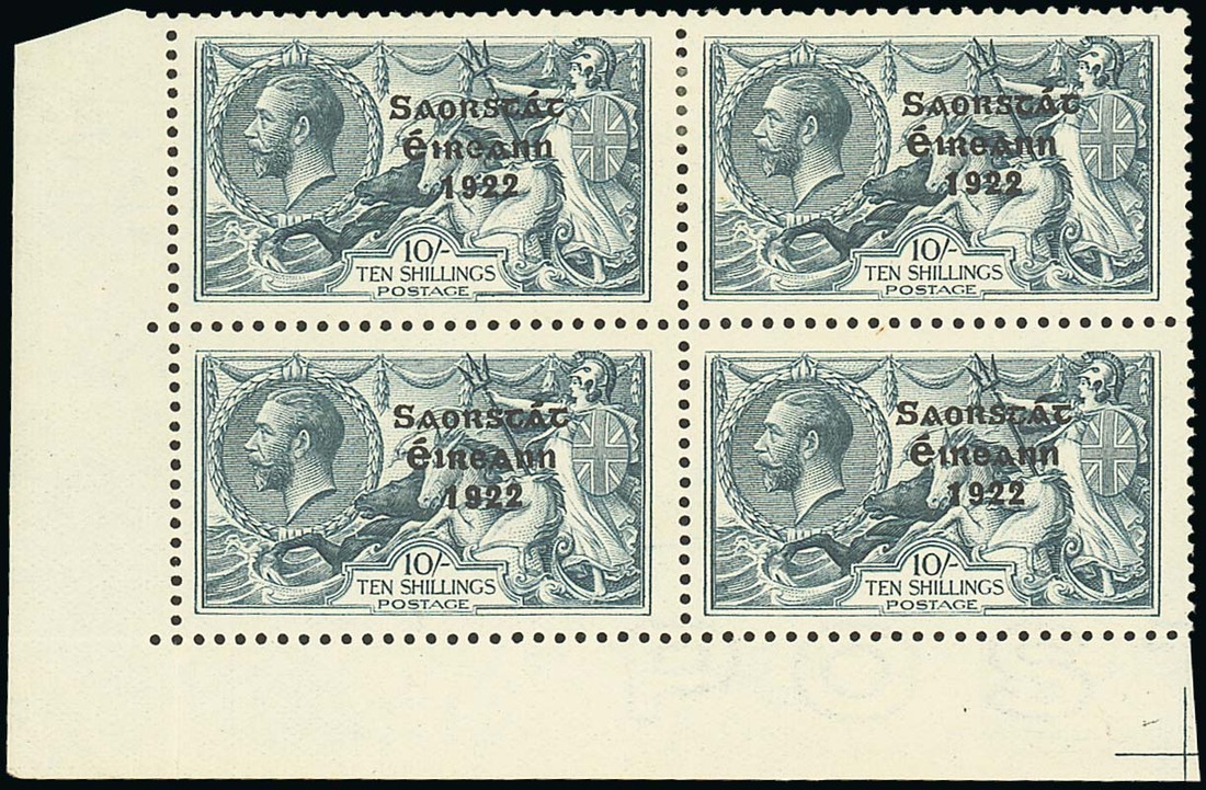 2/6d. pale brown, 5/- rose-carmine and 10/- dull grey-blue, in matching lower left corner blocks of four with each containing variety "S over e", large part original gum with the lower pair in all the blocks remaining unmounted mint; fine and rare. S.G. 64-66, £1,292 as normal hinged singles. Photo