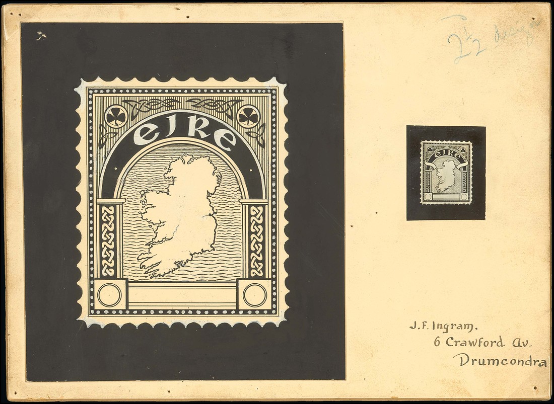 Hand-drawn enlarged essay of the "Map" type in black and Chinese white (design 81x99mm.) without value tablet, also stamp-size photographic essay without values and with ribbons at left and right. Both very similar to the issued type with the river Shannon given more prominence. Photo