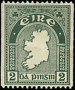 2d. grey-green, perf. 15 x imperf., large part original gum, some light soiling and wrinkling as usual with most of the known genuine examples. The rarest stamp of Ireland with only twenty unused examples recorded. Number XIII of the Brady listing. D. MacDonnell Certificate (2004). S.G. 74b, £13,000. Photo