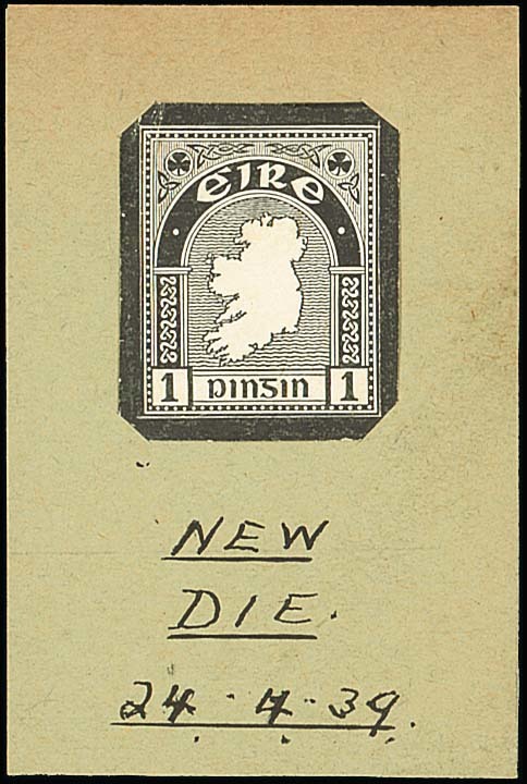 1d. die proof in black with uncleared surrounds on thin surfaced card mounted on piece (49x60mm.), endorsed "new/die/24.4.39" below; small thinnings on reverse. Unique. Also a piece of gummed and watermarked paper (110x69mm.). Photo