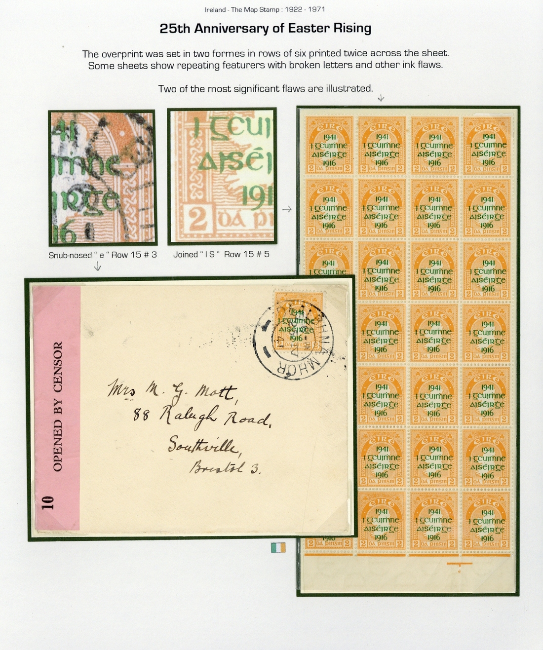 A well written-up collection on pages, ninety eight stamps and twenty-four covers or cards, bearing the 1922-34, 1940-68 "Map of Ireland design, including watermark "e" 1d. and 2d. vertical coil join pairs, 1d. and 2d. vertical gutter pairs, 2d. horizontal coil join pair, 2d. re-used on cover taxed 4d., censored and registered covers, etc., chiefly fine