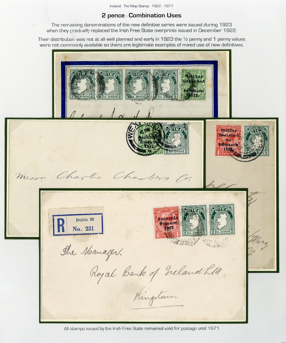 A collection of thirty five covers and cards and a few pieces, bearing the 1922-34, 1940-68 "Map of Ireland design, including 2d. on first day cover (2), cancellations with Krag machine on 2d. (3), 1d. on newspaper wrapper, Experimental "hammerhead" with Dundalk, registered, censored, combination frankings with Great Britain overprinted, Dublin special later fee, reply paid covers from England to Ireland, Express, etc., chiefly fine