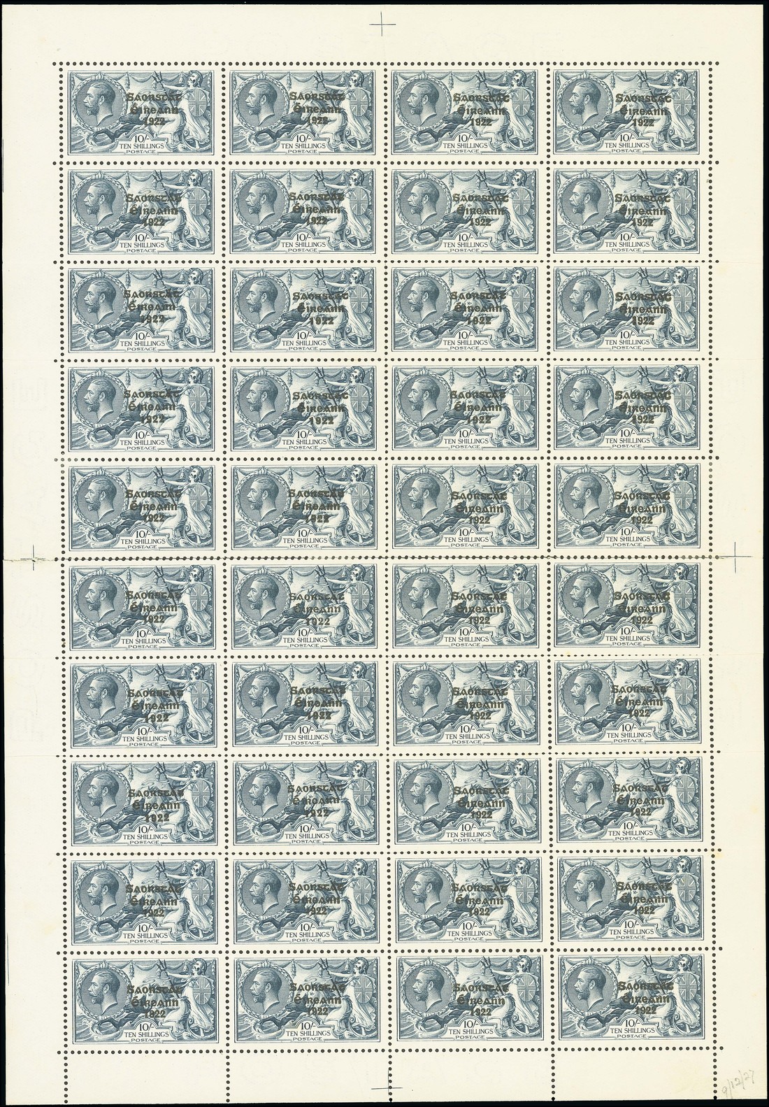10/- dull grey-blue, a complete sheet of forty (4 x 10) containing eleven "wide and narrow date" pairs, seventeen "narrow dates" and one "wide date", one showing the hollow accent on [R3/4] and [R4/4]; five stamps are hinged for re-inforcing, two small spots of aging and separation along the centre horizontal row of perforations, otherwise fine and a marvellous exhibition showpiece. Only three intact sheets are known, one of which has considerable toning and the other is extensively hinged and re-inforced. This is without question one of the most important items of Irish Seahorses in existence. S.G. 85, 85a, 88, £16,000 as hinged singles