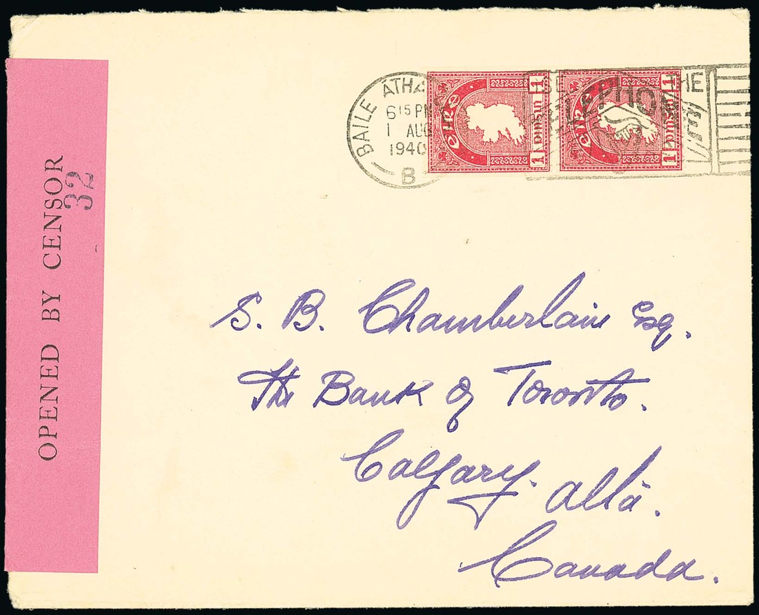 1940-68 1d. carmine, perf. 14 x imperf. vertical pair tied by Baile Atha Claith slogan cancellation on 1940 (1 Aug.) censored envelope to Canada; light bend at foot, otherwise fine and very rare on cover. S.G. 112b. Photo