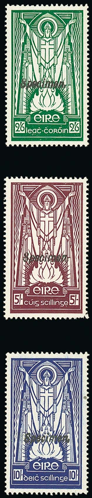 1940-68 2/6d., 5/- and 10/- each overprinted "Specimen", unmounted mint; the 5/- with small corner perf. fault and the 10/- with diagonal crease and paper inclusion. A very rare set. Each with Hamilton-Bowen Certificate (2008). S.G. 123s-125s. Photo