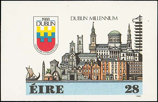 1988 Dublin Millenium 28p. upper right stamp from the English booklet pane, variety imperforate, fine unmounted mint. Very rare with only four examples known. Hamilton-Bowen Certificate (2007). See footnote after S.G. 688. Photo