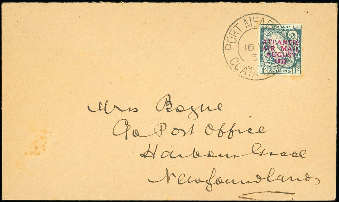1/- light blue overprinted "atlantic/air mail/august/1932" in red, tied by Port Mearnog c.d.s. on 1932 (16 Aug.) envelope to Harbor Grace, Newfoundland; a few lightly stained perfs., otherwise very fine and exceptionally rare. Unrecorded in the Commander Godfrey census. D. MacDonnell Certificate (2010). Photo.