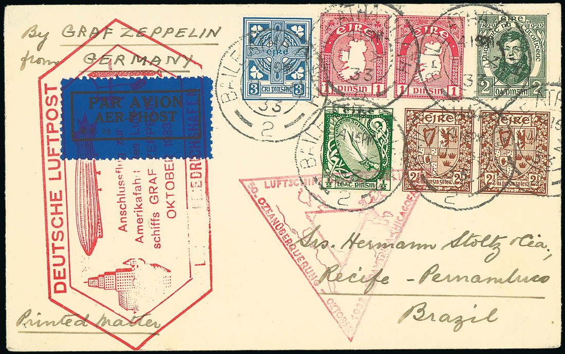 1933 (11 Oct.) Zeppelin "Century of Progress" flight envelope to Brazil, bearing ½d., 1d. (2), 2½d. (2), 3d. and Emancipation 2d. with Baile Atha Cliath cancellations, special red flight cachets, Recife arrival c.d.s. on reverse; fine. Photo