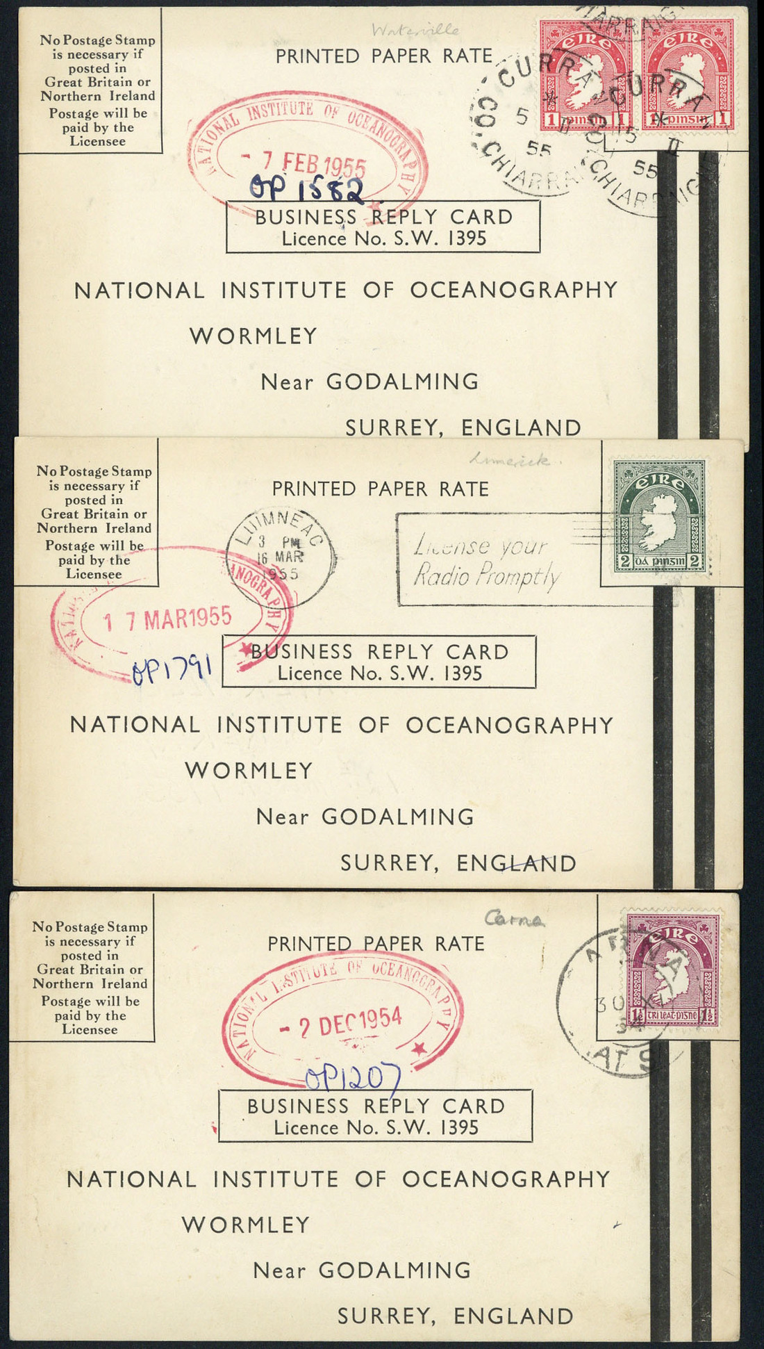1954 "Drift Mail" experiment, three cards (numbers 7189, 9441 and 9453) dropped by R.A.F. aircraft as part of an oil pollution investigation, returned by the finders to Godalming and with 1½d. or 2d. frankings; fine