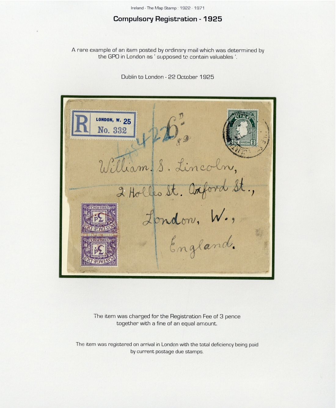 1925 (22 Oct.) envelope to London franked at 2d., registered in London as supposed to contained valuables and taxed by Postage Due 3d. pair; some faults though most unusual compulsory registration, also 1930 and 1933 envelopes registered from Ballyshannon and Dublin