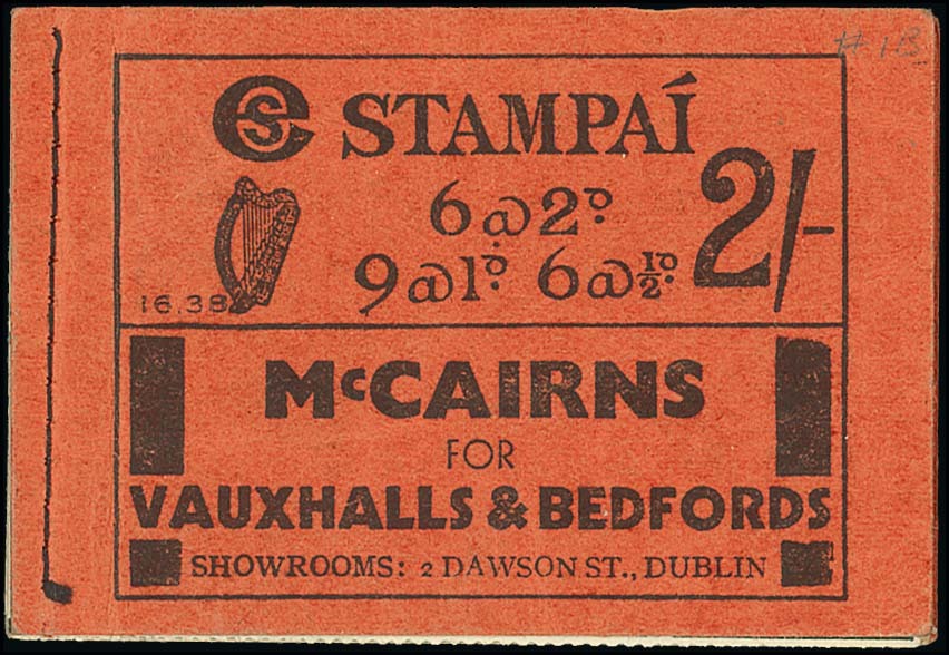 1931-40 2/- (edition 16-38), all panes with inverted watermarks, advertisers voucher with all stamps and labels punched with a triangular hole, mostly good perfs., cover folded, otherwise fine and rare. S.G. SB1. Photo