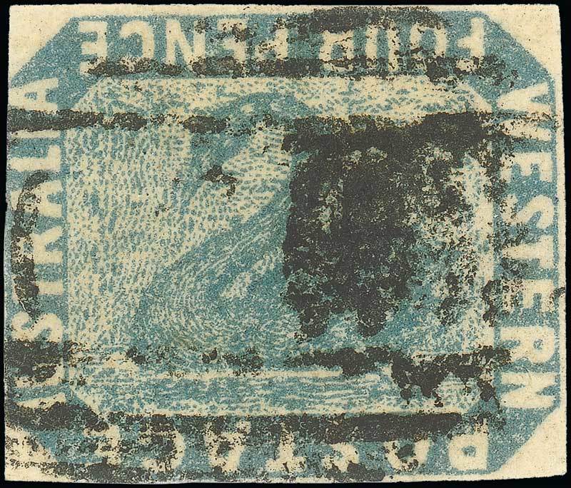 [-] blue showing variety FRAME INVERTED, clear to good margins on three sides, touched along left, rather heavily cancelled by black void obliterator though the variety clearly visible. R.P.S. Certificate (1932). S.G. 3h, £90,000. Photo