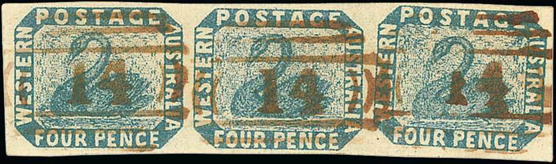 [-] blue horizontal strip of three, the right stamp showing variety tilted border, good to large margins all round, each neatly cancelled "14" (Marradong) in reddish brown, fine. A scarce multiple. B.P.A. Certificate (2007). S.G. 3a/i, £1900. Photo
