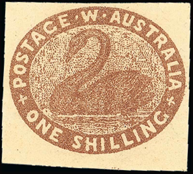 This value, like the 4d., was produced by lithography and was made up from positions [10-234] which incidentally contained the two re-entries, [170] and [171], of the 1d. value repeated four times to make up a sheet of 240. Only the swan portion of the design was used, the oval frame with blank corners being added later.