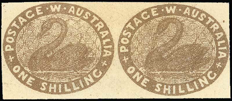This value, like the 4d., was produced by lithography and was made up from positions [10-234] which incidentally contained the two re-entries, [170] and [171], of the 1d. value repeated four times to make up a sheet of 240. Only the swan portion of the design was used, the oval frame with blank corners being added later.