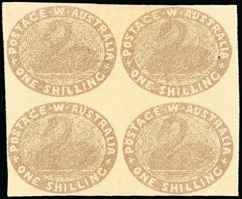A block of four with margins all round (just clear in two places), without gum, fine. B.P.A. Certificate (2007). S.G. 4c, £1900. Photo