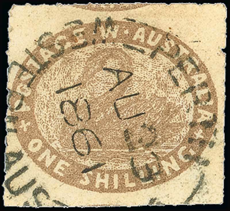 Grey-brown with roulettes or traces thereof on all sides, neatly cancelled by large part "perth/western australia" c.d.s. (23.8.61), fine. B.P.A. Certificate (2007). S.G. 6, £1100. Photo