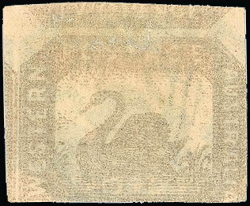 An example with large margin at top and showing part of adjoining stamp at right, lightly cancelled, variety printed both sides showing portions of three stamps, very fine. S.G. 15a, £800. Photo