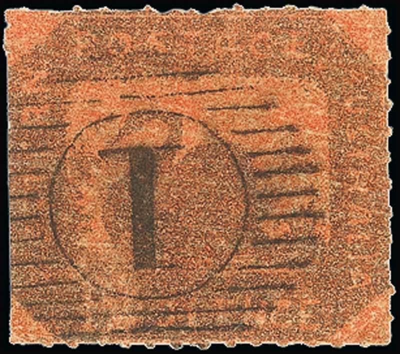 Brown-black on Indian red showing roulettes on three sides, clearly cancelled "1", good colour, fine. B.P.A. Certificate (2007). S.G. 21, £1800. Photo