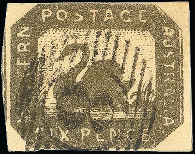An example with small to large margins on three sides showing portion of adjoining stamp at left, touched at top, cancelled "8" (Fremantle), fine. S.G. 18, £650. Photo