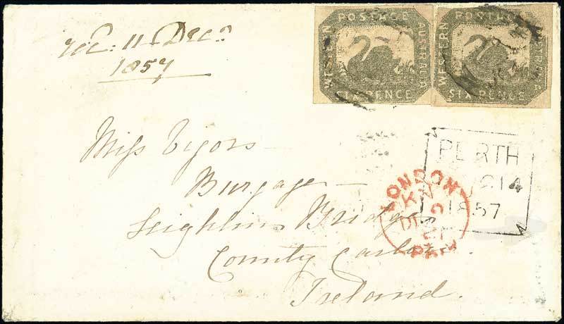 1857 (14 Oct.) envelope to Ireland, bearing 6d. black-bronze (2, both with four margins, one with scissor-cut in margin at lower left), both cancelled by void obliterator, showing Perth boxed d.s. and red London Paid (9.12) datestamps below with Dublin and arrival datestamps on reverse; the envelope with some pinholes well clear of adhesives. A rare and most delightful franking. B.P.A. Certificate (2007). S.G. 18. Photo