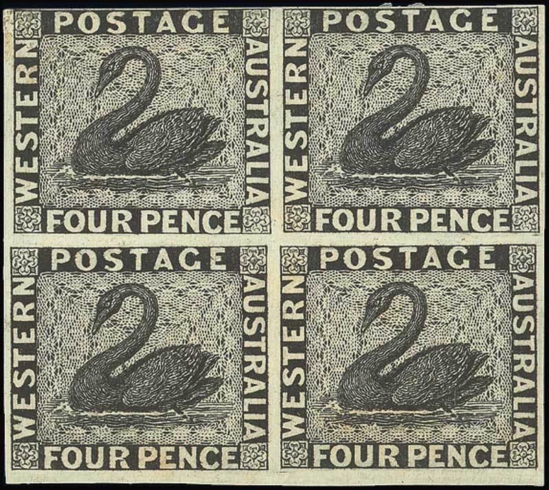 4d. block of four in black on wove paper, margins just clear at top, fine. Photo