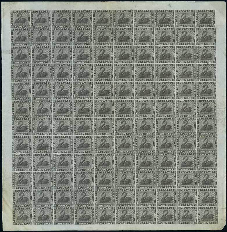 2d. in black on bluish paper, a complete sheet of 120, some faults though a remarkable and highly important item of Western Australia philately. Unique. Photo