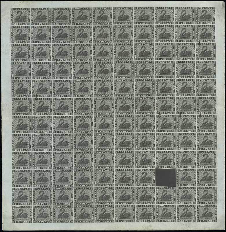 6d. in black on bluish paper, a complete sheet of 120 less [98] which has been excised, probably by the printer; some faults though a remarkable and highly important item of Western Australia philately. Unique. Photo