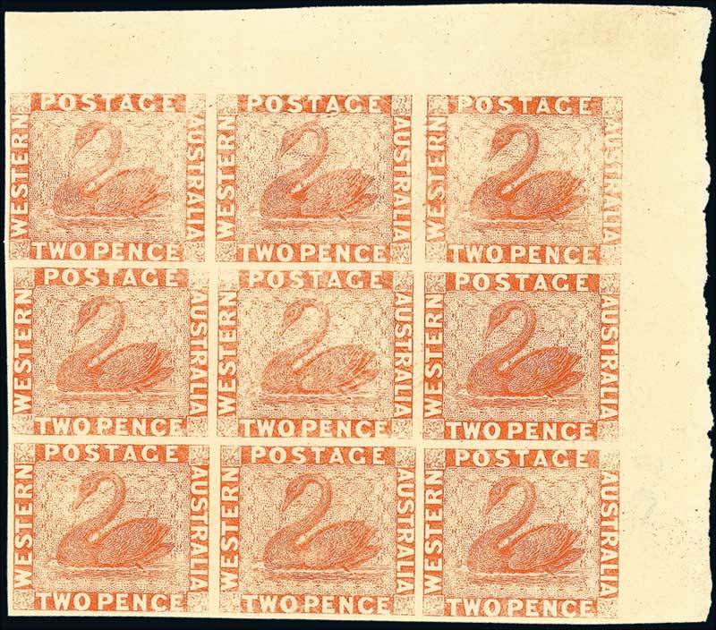 2d. pale orange top right corner block of nine, unused without gum, some minor wrinkles/creases otherwise fine. S.G. 26, £1080. Photo