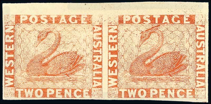 2d. pale orange horizontal pair from the top of the sheet, [8-9] with [9] showing variety "plank on head", unused without gum, fine. S.G. 24, £240+. Photo