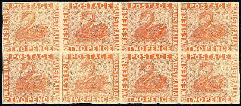 2d. orange-vermilion block of eight (4x2), unused without gum, margins on three sides; the first vertical pair with two small thins otherwise fine. S.G. 25, £1040. Photo