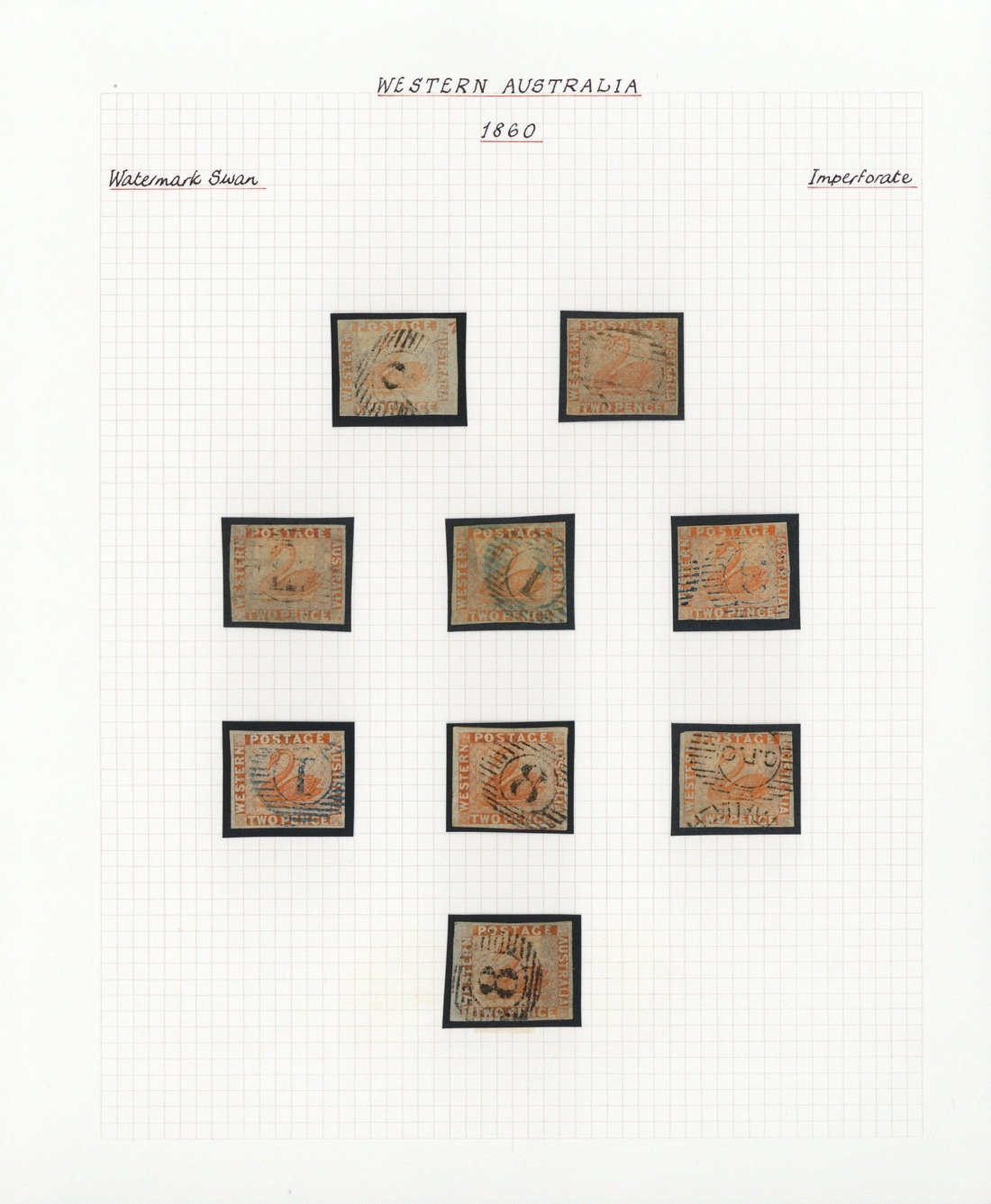 2d. used range in shades of pale orange/orange-vermilion and one in deep vermilion, all with four margins, two clearly cancelled "1" in blue, one cancelled "3" in blue and two cancelled "8", generally fine. S.G. 24-26, £1440