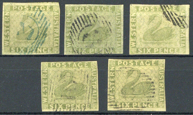 6d. sage-green (shades), five used examples, all with four margins (some cut close in places), generally fine. S.G. 28, £2000