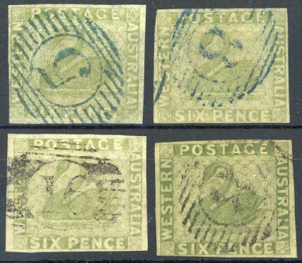 6d. sage-green (shades), four used examples, one touched at lower left otherwise with close to good margins, one cancelled "5", two cancelled "8" (one in blue) and one cancelled "16", generally fine. S.G. 28, £1600