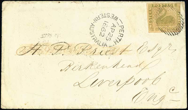 6d. sage-green with clear to good margins, clearly tied on 1862 (25 Apr.) envelope from Perth to Liverpool, showing fine despatch c.d.s. alongside with arrival datestamp (16.6) on reverse; the envelope with addressee's name erased and another name substituted. B.P.A. Certificate (2007). S.G. 28. Photo