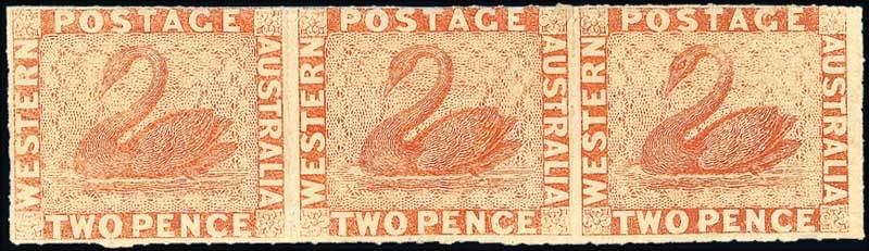 2d. pale orange strip of three with roulettes on all sides, unused without gum, the centre stamp diagonally severed and rejoined, fine. R.P.S. Certificate (1933). S.G. 29, £2250. Photo
