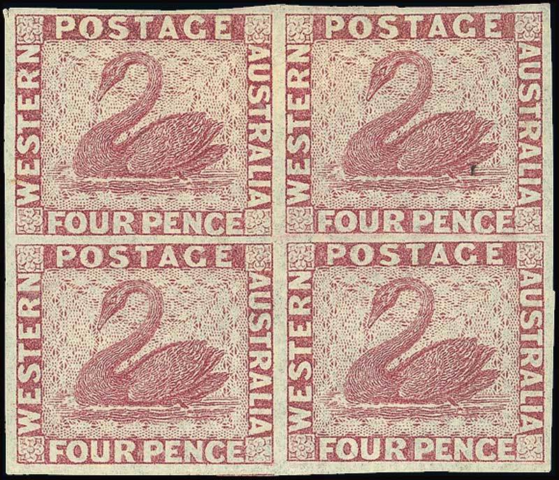 4d. in carmine, a block of four in dull claret, fine. Photo